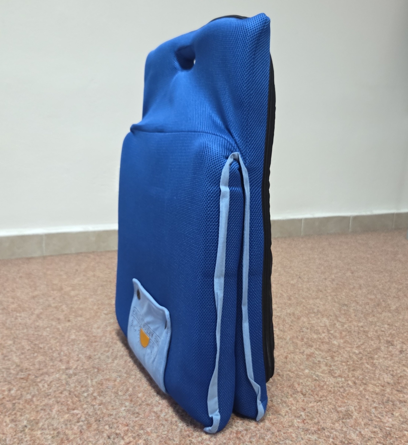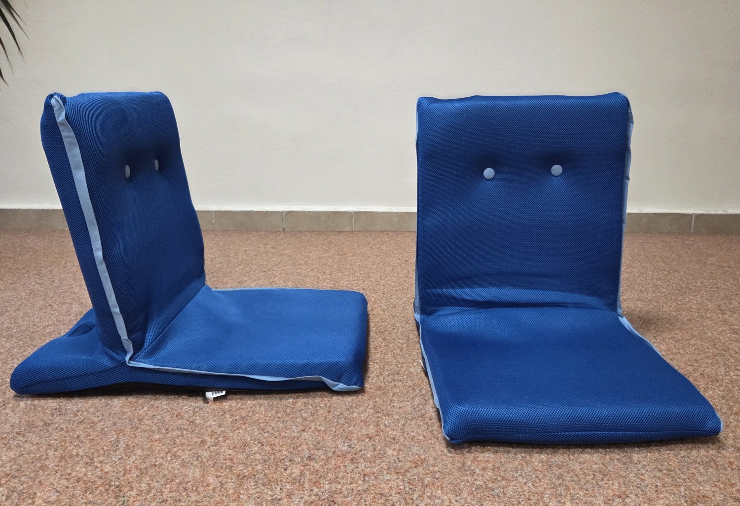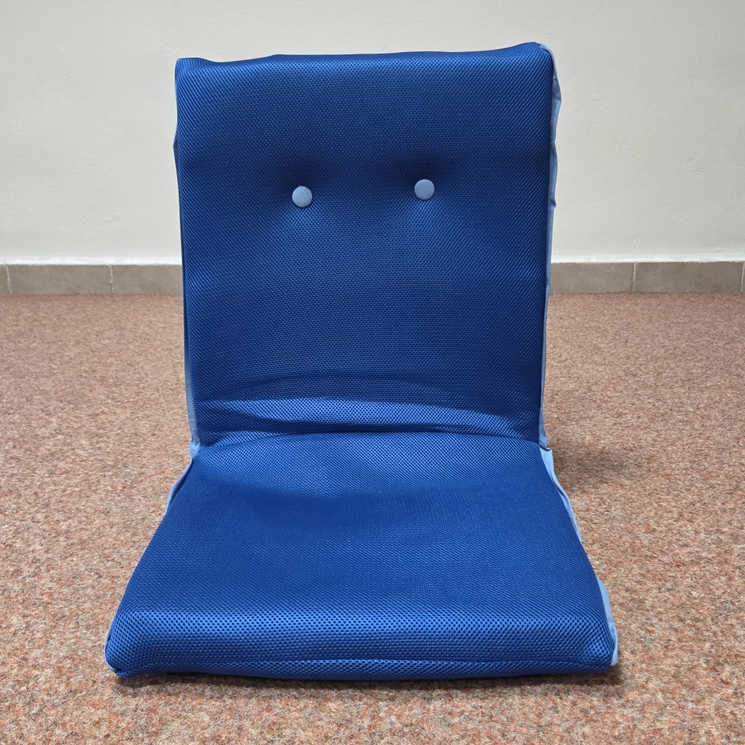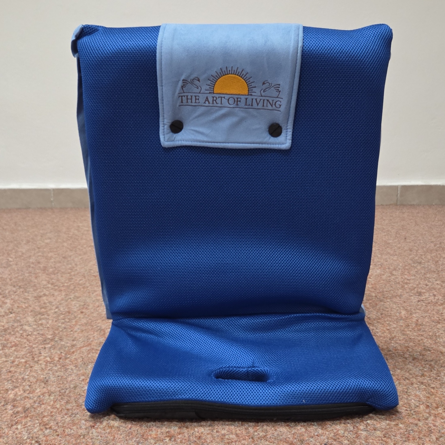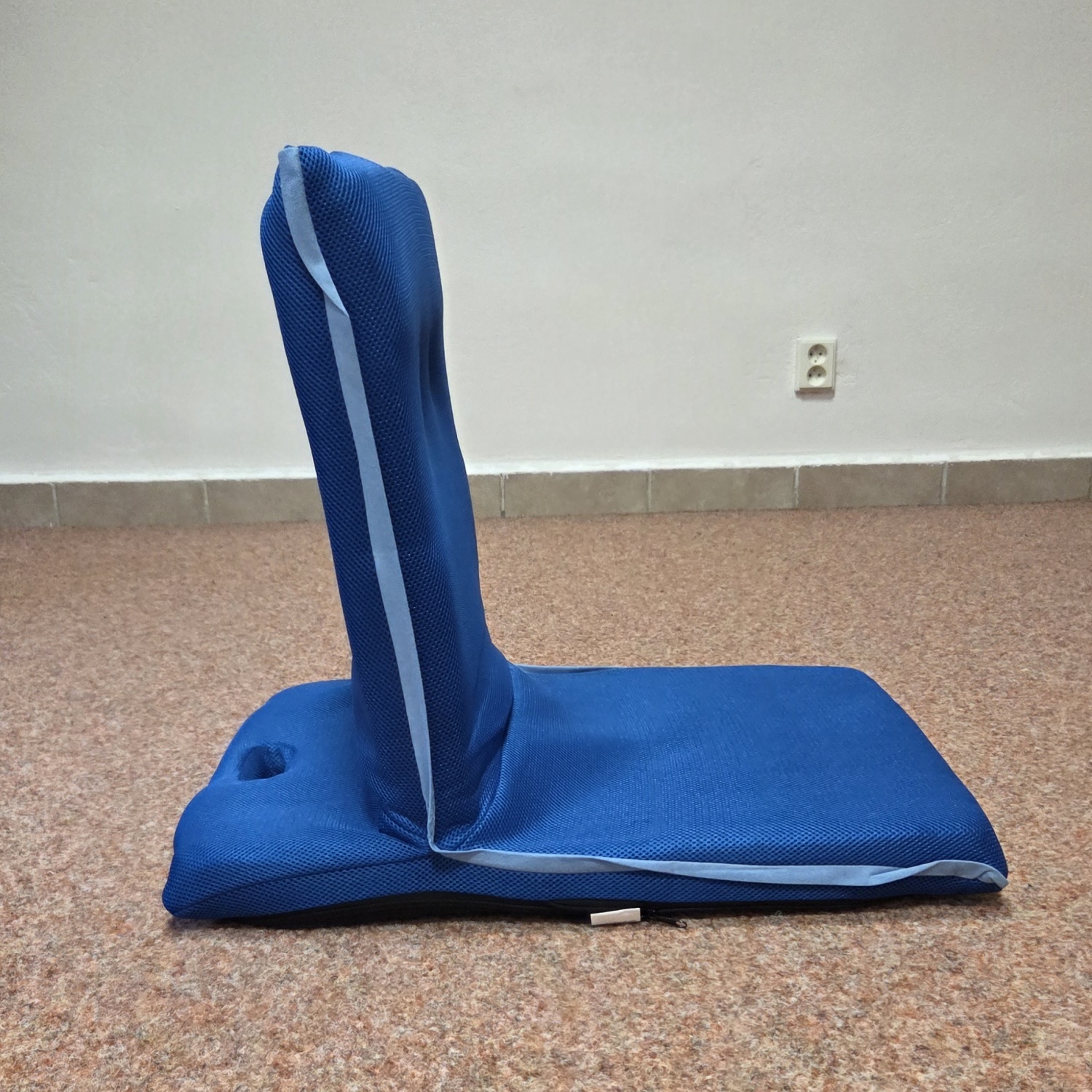 Skládací meditační židle / meditační křeslo modré barvy s měkkým polstrováním poskytuje pohodlnou oporu zad a zdravé držení těla při meditaci. Díky lehké konstrukci a rukojeti ji snadno přenesete kamkoli.